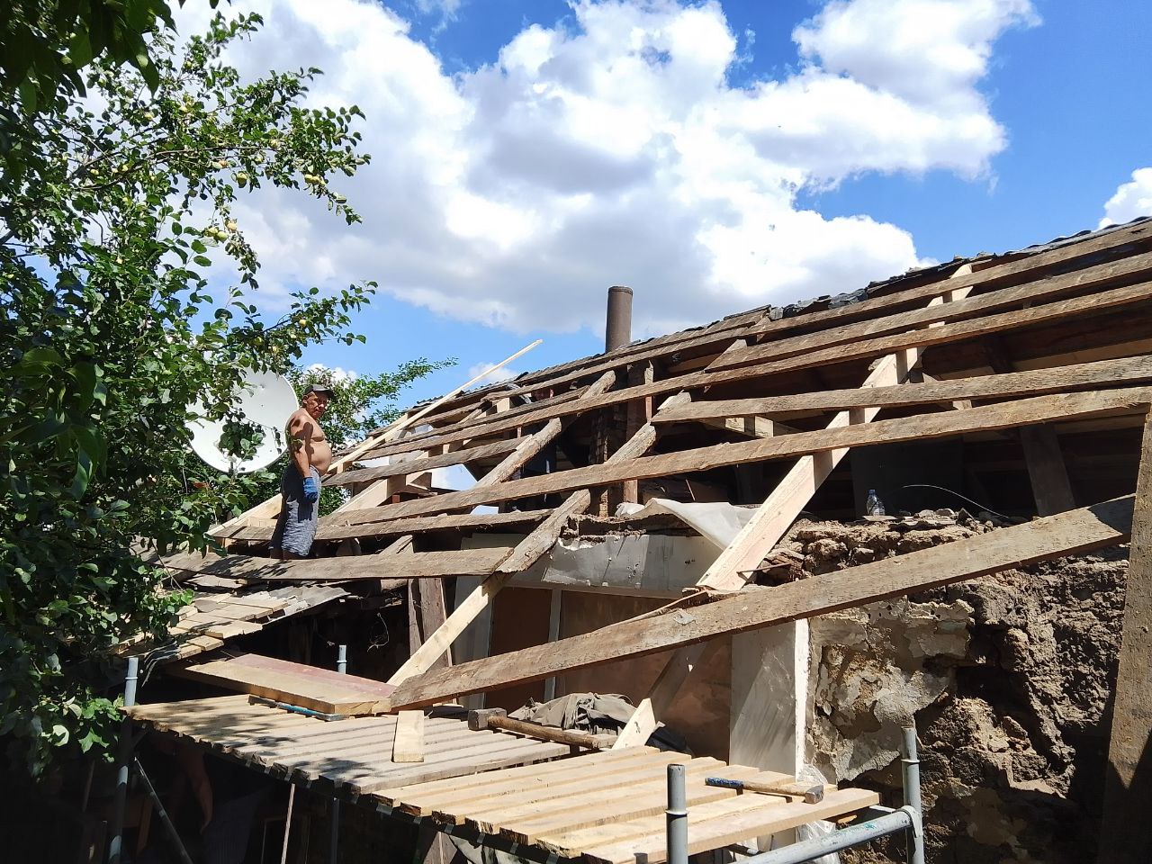 Недавно наши добровольцы-ремонтники ремонтировали одну необычную крышу: — Черепица на крыше была старинная, терракотовая. Обычно ребята работают с простым пыльным шифером. А тут — аварийная, но красивая крыша, и очень тяжелая. Дом вызвал тревогу. Как его ремонтировать? Стены повреждены, с улицы виден слой старых обоев, потолки провисшие. Казалось, если тронуть крышу — вообще все рухнет.