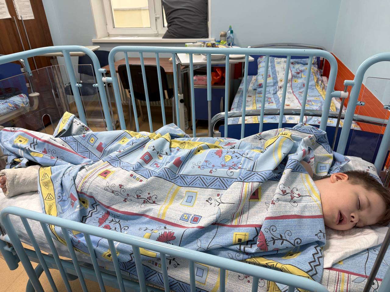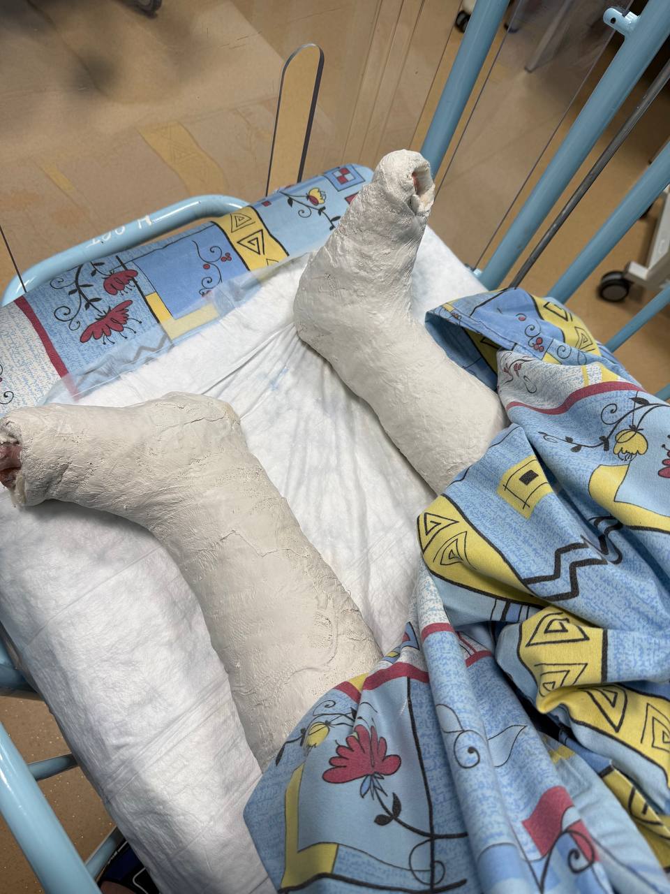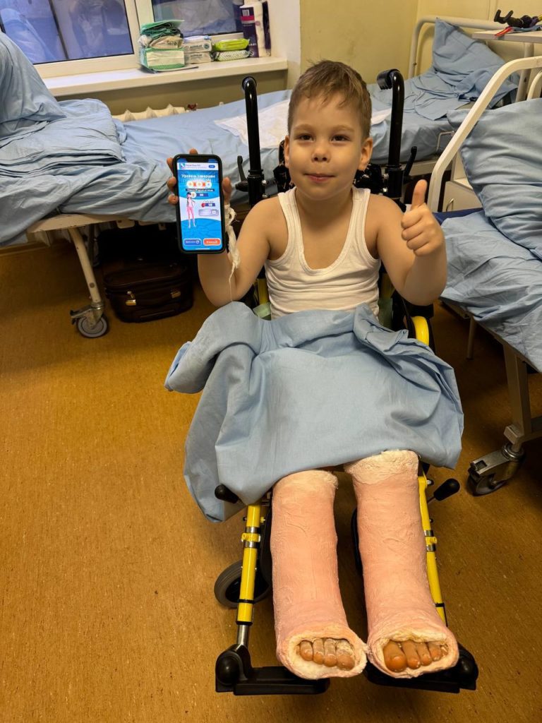 В прошлом году Святославу сделали очень сложную — уже третью — операцию, которая даст ему возможность уверенно ходить. Ему распилили кости ступней и вставили туда кусочки его же малоберцовых костей. Это было очень болезненно, полгода мальчик находился со спицами в ногах и в тяжёлом, как гири, гипсе.