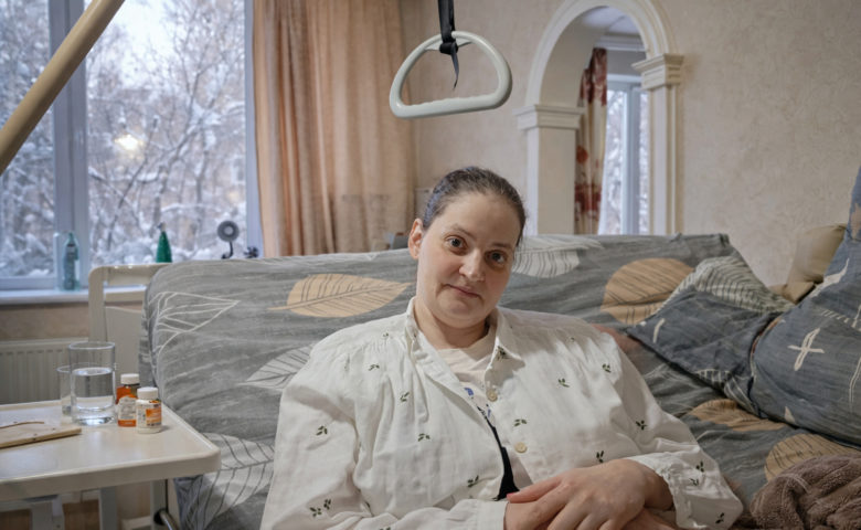 Жизнь женщины сузилась до двух метров медицинской кровати. Но даже на ней она не может двигаться самостоятельно. Во всём помогает сиделка — умываться, делать зарядку, выполнять медицинские процедуры.